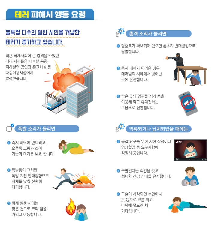 - 이와 관련, 인파가 몰리는 주요 관광지와 크리스마스 마켓 등 다중밀집시설을 방문하시는 우리 국민들께서는 아래 테러 피해시 행동요령을 숙지하시어 비상상황 발생에 대비하시기 바랍니다.